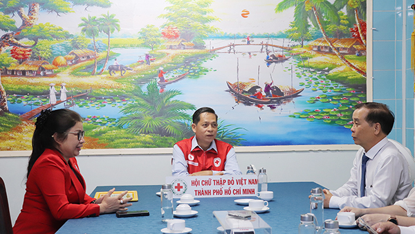 Ông Trần Văn Tuấn - Phó Chủ tịch phụ trách chung (ngồi chính giữa) cùng bà Đặng Thị Minh Hiếu - Phó Chủ tịch Hội Chữ thập đỏ Thành phố (ngồi bên trái) tiếp ông Võ Hồng Minh Công - Phó Bí thư, Phó Giám đốc Bệnh viện Nhân dân Gia Định (ngồi bên phải)