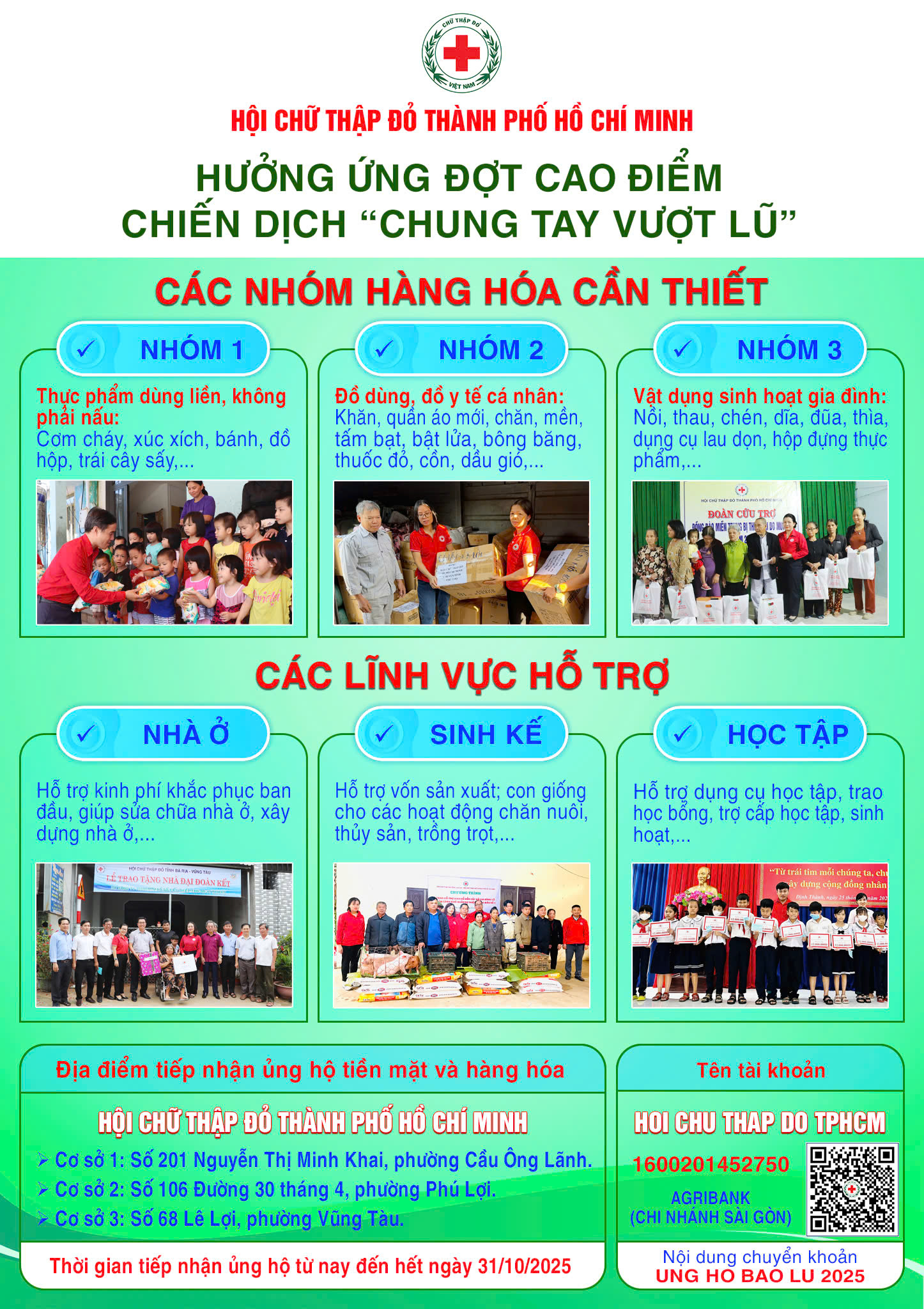 Hội Chữ thập đỏ Thành phố Hồ Chí Minh tiếp tục kêu gọi các tổ chức, doanh nghiệp, cá nhân, nhà hảo tâm cùng chung tay sẻ chia, hưởng ứng mạnh mẽ đợt cao điểm Chiến dịch “Chung tay vượt lũ” với đồng bào bị thiệt hại do thiên tai, giúp họ sớm vượt qua khó khăn, ổn định cuộc sống.