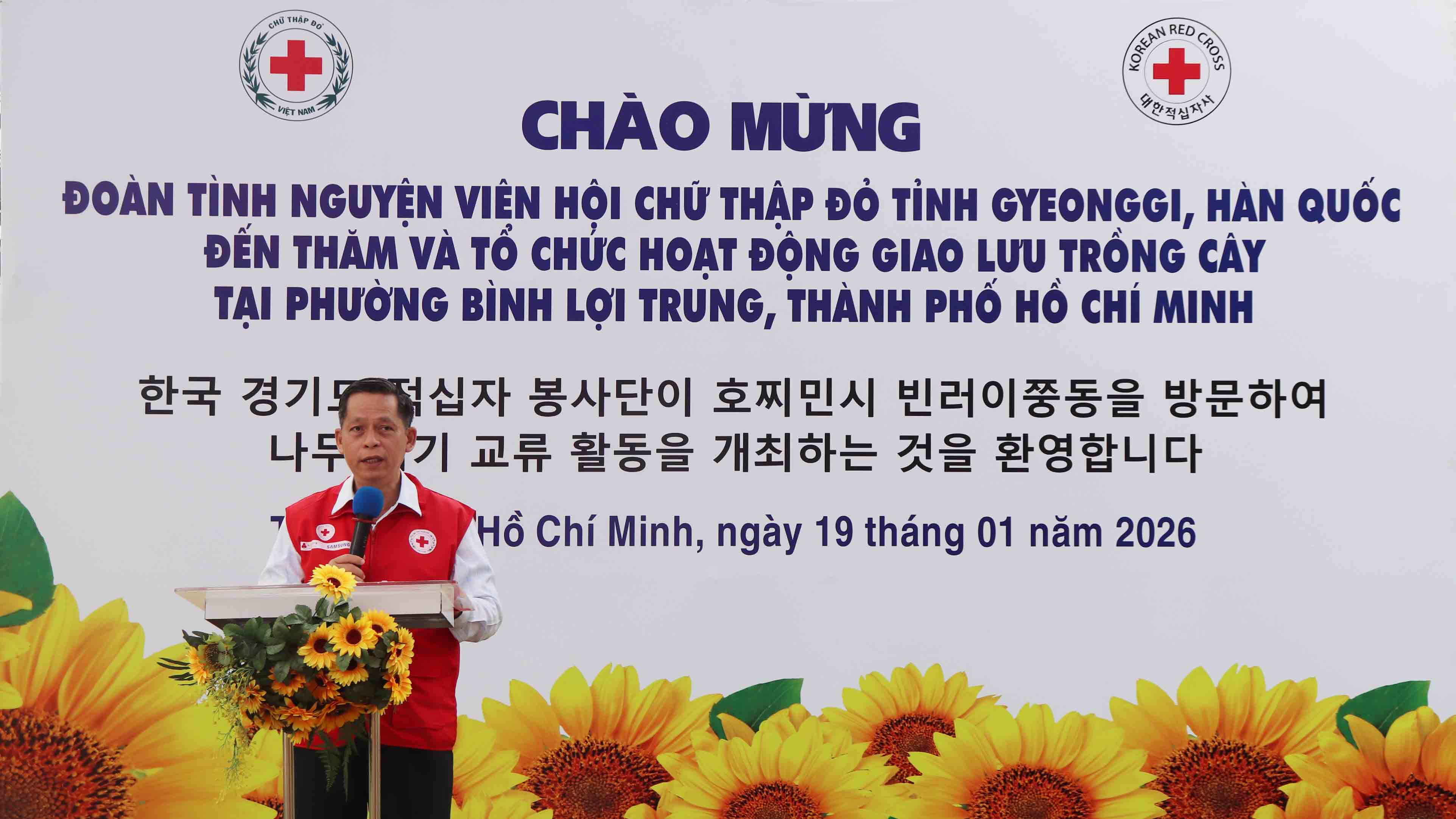 Phát biểu tại chương trình, Phó Chủ tịch (phụ trách chung) Hội Chữ thập đỏ Thành phố ông Trần Văn Tuấn nhấn mạnh “Cây xanh không chỉ mang lại bóng mát, điều hòa không khí mà còn góp phần bảo vệ môi trường sống, giảm ô nhiễm, hạn chế xói mòn đất và tạo cảnh quan xanh - sạch - đẹp. Bên cạnh đó, cây xanh còn có vai trò quan trọng trong việc cân bằng hệ sinh thái, cải thiện sức khỏe tinh thần con người và nâng cao chất lượng cuộc sống. Trong bối cảnh biến đổi khí hậu và ô nhiễm môi trường ngày càng gia tăng, mỗi cây xanh được trồng hôm nay chính là một hành động thiết thực vì tương lai xanh hơn cho cộng đồng và cho các thế hệ mai sau. Buổi trồng cây hôm nay không chỉ mang ý nghĩa bảo vệ môi trường, mà còn thể hiện tinh thần nhân đạo, đoàn kết và sẻ chia - những giá trị cốt lõi mà phong trào Chữ thập đỏ luôn vun đắp. Đây cũng là minh chứng sinh động cho mối quan hệ hữu nghị, hợp tác tốt đẹp giữa Việt Nam và Hàn Quốc, đặc biệt là sự gắn bó, đồng hành giữa Hội Chữ thập đỏ tỉnh Gyeonggi và các đối tác tại Việt Nam. Chúng tôi rất trân trọng sự quan tâm, hỗ trợ và những đóng góp quý báu của Hội Chữ thập đỏ tỉnh Gyeonggi trong các hoạt động nhân đạo, xã hội và môi trường tại Việt Nam nói chung và TP Hồ Chí Minh nói riêng. Hy vọng rằng, những mỗi cây xanh được trồng hôm nay sẽ sinh trưởng xanh tốt, trở thành biểu tượng đẹp cho tình hữu nghị, cho tinh thần tình nguyện và trách nhiệm chung đối với môi trường sống của chúng ta”.