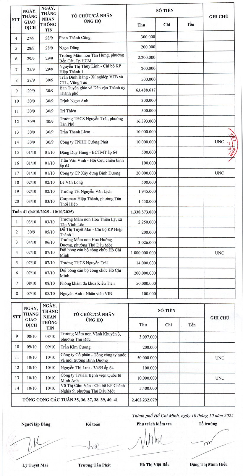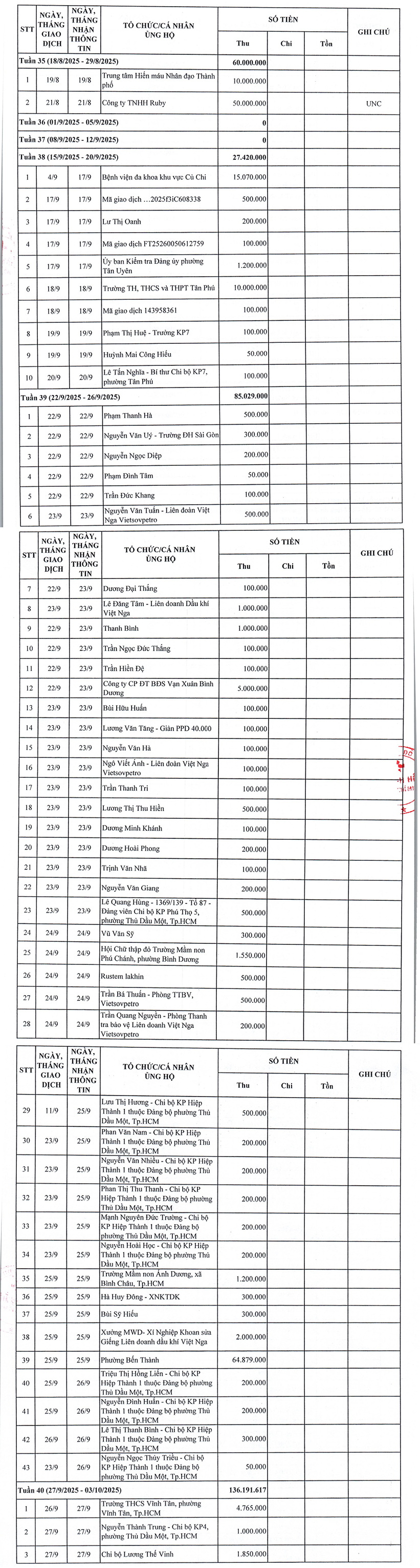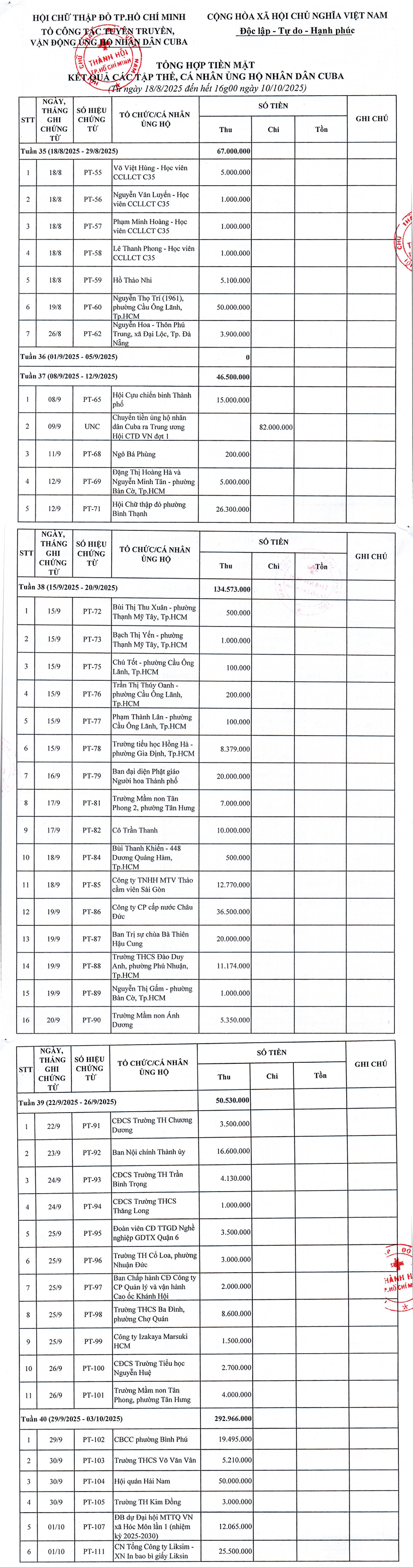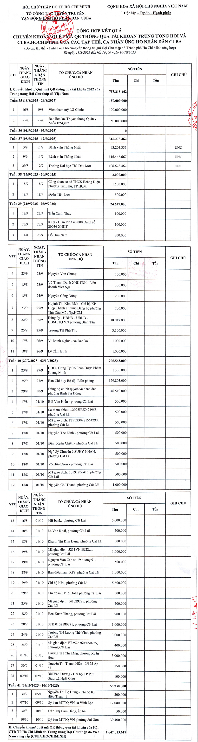 Trong quá trình tổng hợp kết quả vận động ủng hộ nhân dân Cuba, các tổ chức, doanh nghiệp, nhà hảo tâm và các cá nhân khi thực hiện chuyển khoản (vào số tài khoản 2022, chủ tài khoản: Trung ương Hội Chữ thập đỏ Việt Nam) chưa ghi rõ nội dung “CUBA HOCHIMINH”. Do đó, việc thống kê, tổng hợp có thể chưa đầy đủ, Hội CTĐ thành phố trân trọng đề nghị các đơn vị và các cá nhân đã thực hiện chuyển khoản ủng hộ nhưng chưa được ghi nhận trong danh sách tổng hợp này, vui lòng liên hệ và cung cấp phiếu ủy nhiệm chi hoặc phiếu chuyển khoản thành công đến Zalo: