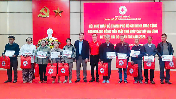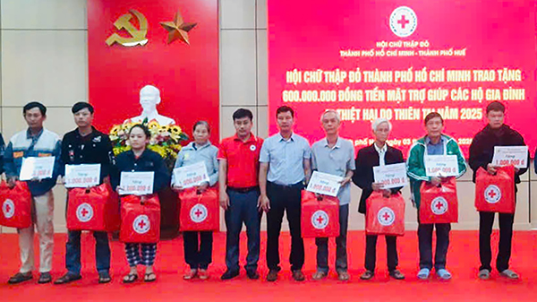 Ngày 03/12, Đoàn công tác Hội Chữ thập đỏ Thành phố Hồ Chí Minh đã đến thăm và trao quà hỗ trợ người dân bị thiệt hại do thiên tai năm 2025 tại thành phố Huế. Tham gia đoàn có các Phó Chủ tịch Hội Chữ thập đỏ Thành phố: ông Tống Xuân Giang, ông Lê Văn Hậu và ông Vũ Văn Hùng, cùng đại diện Ban Xã hội và Chăm sóc sức khỏe.
