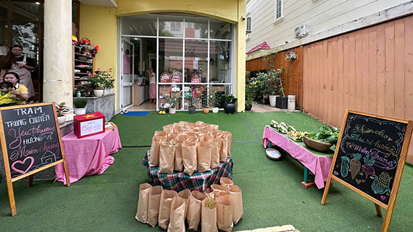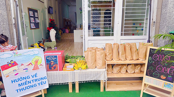 Quang cảnh “Phiên chợ yêu thương - Trạm trung chuyển hướng về miền Trung” tại Mầm non Hòa nhập và Trung tâm can thiệp Pippon Academy