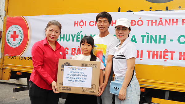 Chiều ngày 11/10, xuất phát từ cuộc gọi điện thoại trực tiếp đến ông Trần Văn Tuấn - Phó Chủ tịch (Phụ trách chung) Hội Chữ thập đỏ Thành phố. Gia đình ông Minh được Hội tư vấn ủng hộ những nhu yếu phẩm cần thiết cho người dân vùng bị bão lũ lúc này, gồm các món hàng: Dầu gió, dầu nóng, khăn, kem đánh răng, bàn chải, xà phòng giặt đồ…