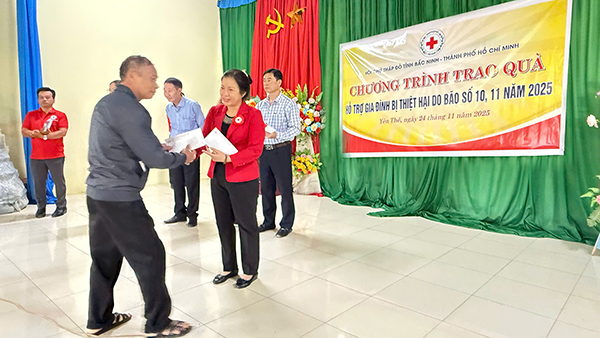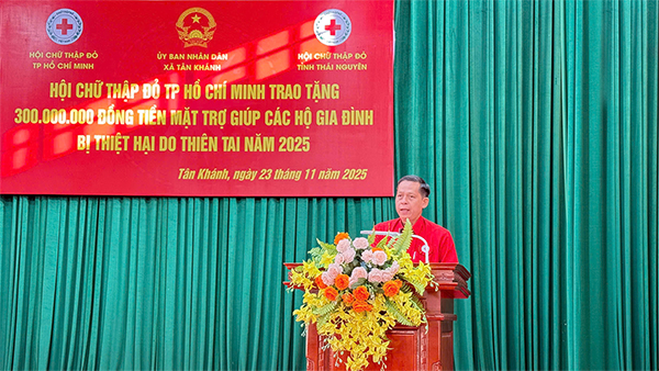 Trong hai ngày 23 - 24/11, Đoàn công tác Thành phố Hồ Chí Minh do ông Trần Văn Tuấn - Phó Chủ tịch (phụ trách chung) Hội Chữ thập đỏ Thành phố Hồ Chí Minh làm Trưởng đoàn đã đến thăm và trao hỗ trợ cho người dân tỉnh Thái Nguyên và tỉnh Bắc Ninh bị ảnh hưởng bởi thiên tai. Đoàn đã đến thăm và trao 600 phần quà, mỗi phần trị giá 1.000.000 đồng trong đó 300 phần tại xã Tân Khánh, tỉnh Thái Nguyên và 300 phần tại xã Yên Thế, tỉnh Bắc Ninh. Tại các địa phương, ông Trần Văn Tuấn - Phó Chủ tịch (phụ trách chung) cùng đoàn công tác đã thăm hỏi sức khỏe, chia sẻ những thiệt hại, khó khăn của người dân và động viên các gia đình sớm ổn định cuộc sống.