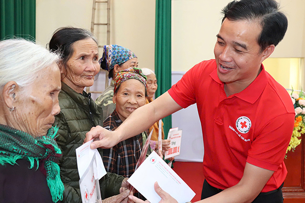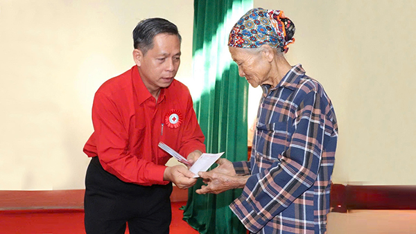 Ông Tống Xuân Giang - Phó Chủ tịch Hội Chữ thập đỏ TP Hồ Chí Minh trao quà đến hộ dân xã Yên Thế, tỉnh Bắc Ninh