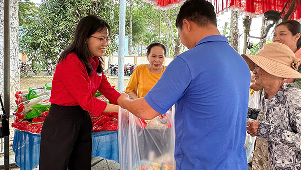 Bà Bùi Thị Phương Dung - Chủ tịch Hội Chữ thập đỏ xã trao nhu yếu phẩm cho người đi “Chợ Tết Nhân ái”